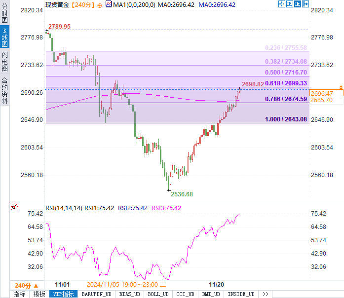 技术面上,黄金在突破2665美元的关键阻力后进一步上行,接近2700美元的心理关口。2665美元一线曾是回调行情的50%斐波那契回撤位及100周期简单移动平均线的共振点,其有效突破显著增强了市场多头信心。技术指标显示日线动能正逐步增强,预示未来走势仍有进一步上行空间。若黄金价格能有效突破2700美元,将可能测试2710-2711美元的供应区间,甚至挑战2736美元的下一关键阻力位。